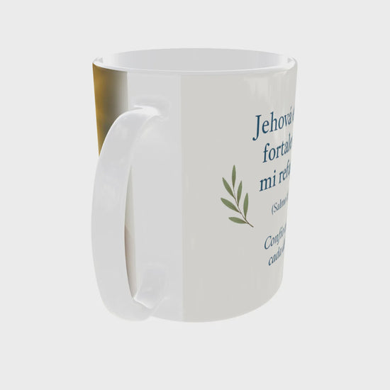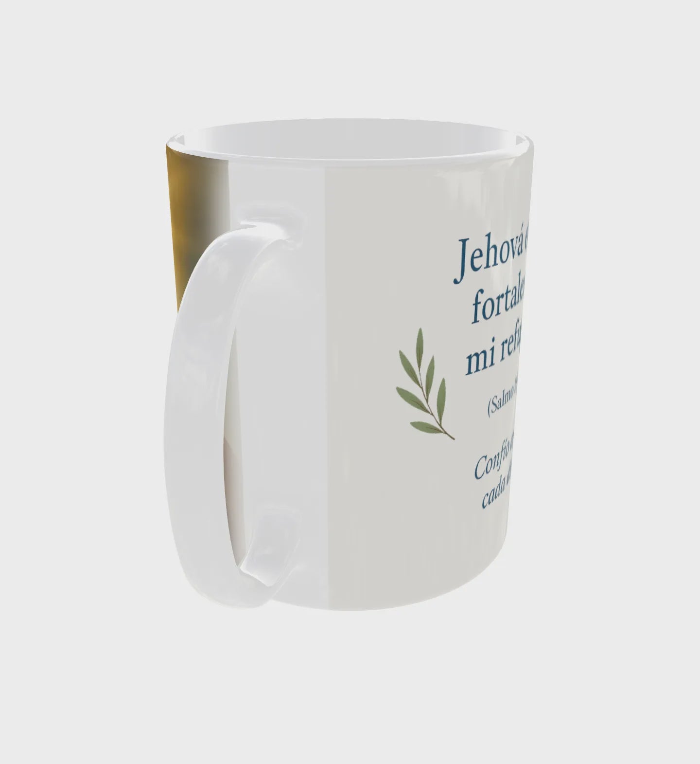 Start your day with peace and inspiration with this beautiful 11 oz Christian mug featuring Psalm 18:2: “Jehovah is my strength and my refuge.”