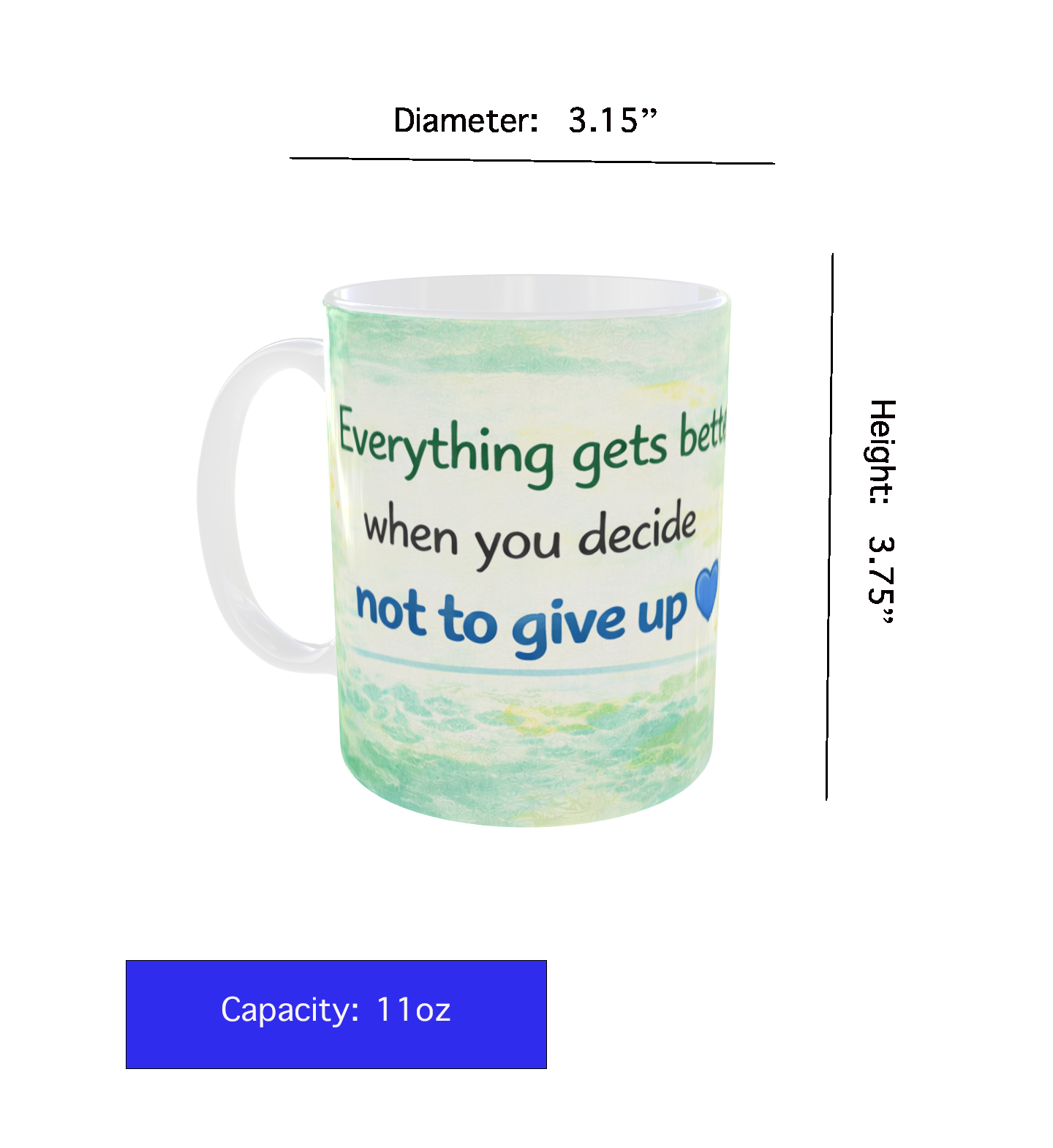 This 11 oz ceramic mug features an uplifting message that reminds you that everything improves when you choose not to give up. Perfect for daily inspiration at home or work.